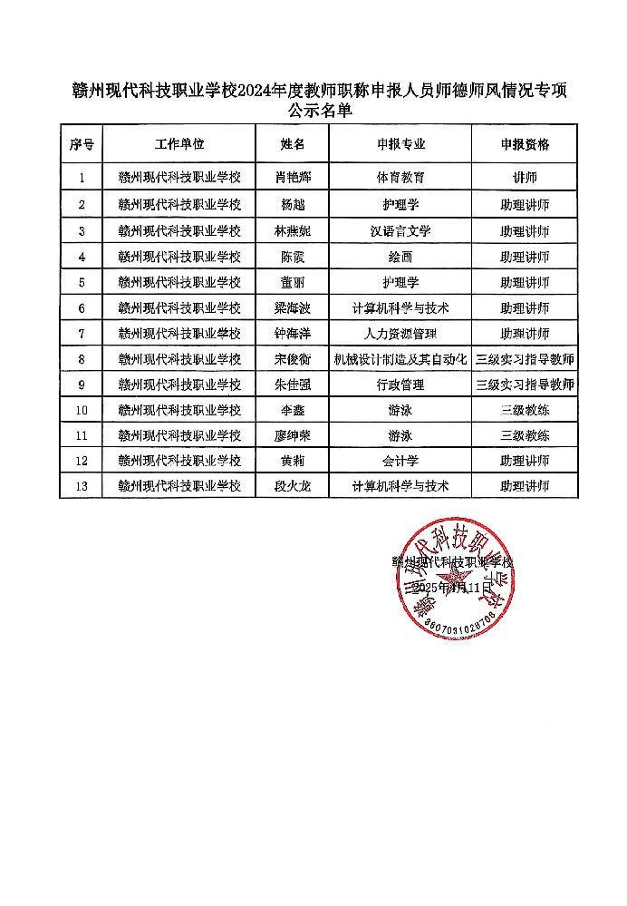 贛州現(xiàn)代科技職業(yè)學(xué)校2025年度教師職稱(chēng)申報(bào)人員師德師風(fēng)情況專(zhuān)項(xiàng)公示