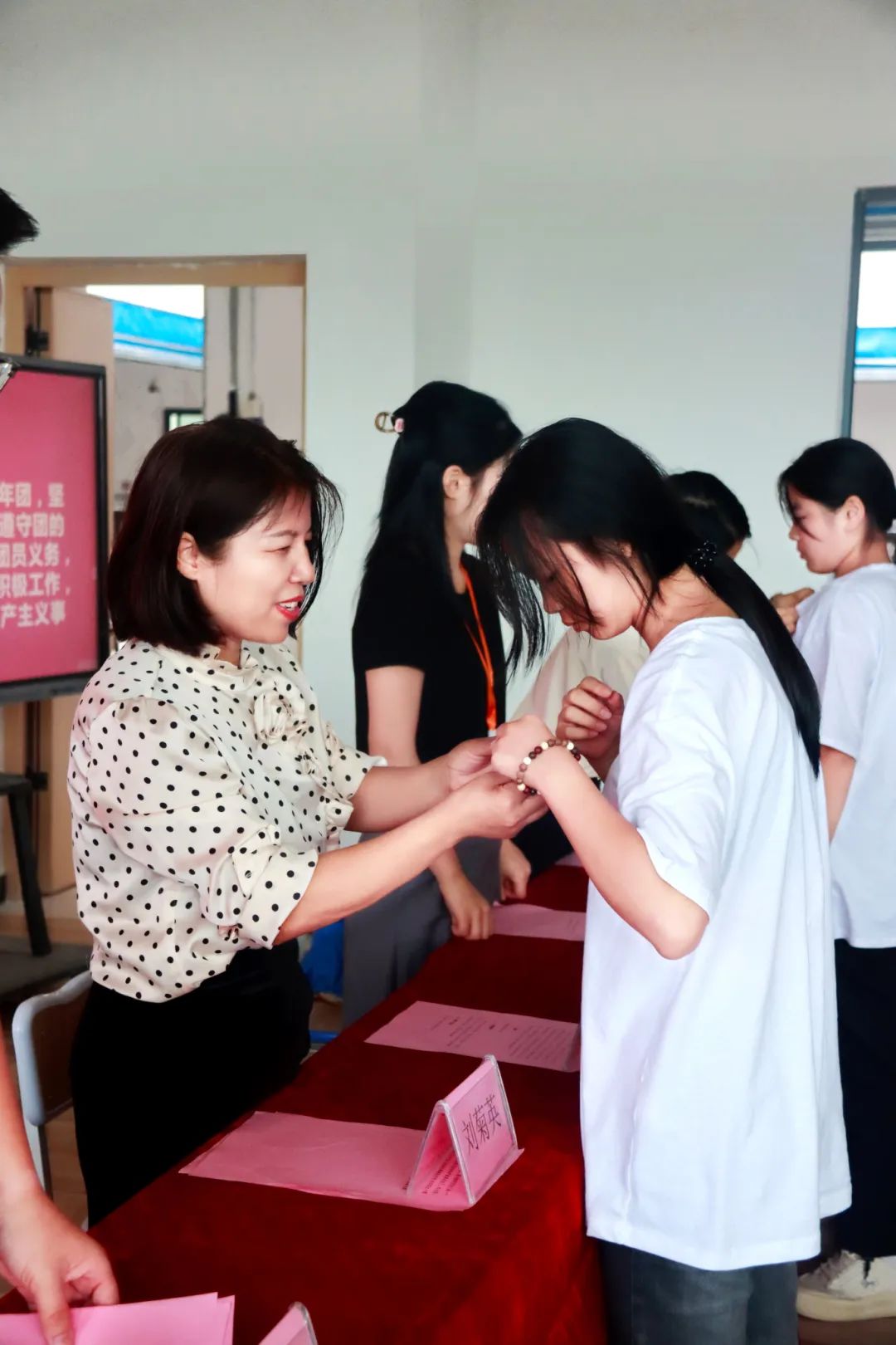 校領(lǐng)導(dǎo)及團(tuán)委老師們?yōu)槲覀冃聢F(tuán)員佩戴團(tuán)徽。團(tuán)徽是代表共青團(tuán)的徽章,它不是一個(gè)普通的裝飾品,而是共青團(tuán)員肩負(fù)重任的標(biāo)志,共青團(tuán)給團(tuán)員頒發(fā)團(tuán)徽,是對每位團(tuán)員的信任,也給團(tuán)員提出了要求,我們相信并要求每個(gè)團(tuán)員,努力學(xué)習(xí),積極向上,充分發(fā)揮團(tuán)員模范帶頭作用,我們每個(gè)團(tuán)員從佩戴上團(tuán)徽的這一刻起,就要認(rèn)清自己肩負(fù)的責(zé)任,努力履行團(tuán)員的義務(wù),用實(shí)際行動來表明自己無愧于“共青團(tuán)員”這個(gè)光榮的稱號。